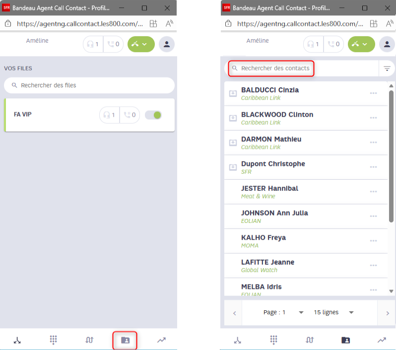 Le bandeau agent comporte un annuaire interne implémenté par l’administrateur de la solution. Il permet à l’agent d’appeler facilement un interlocuteur en dehors de la solution Call Contact, voir de lui transférer un appel entrant.