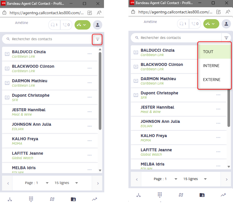 Vous pouvez également trier vos contact entre ceux qui sont internes à votre société et ceux qui sont externes en cliquant pour les 3 traits encadré ci-dessous.