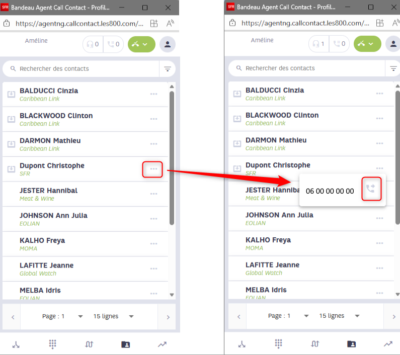 Une fois votre contact identifié dans l’annuaire du bandeau agent, la procédure pour initier un appel est simple et rapide. Cliquez sur les trois petits points situés à droite du nom du contact. Cette action permet d’afficher son numéro. Cliquez sur le symbole du téléphone pour déclencher immédiatement l’appel.