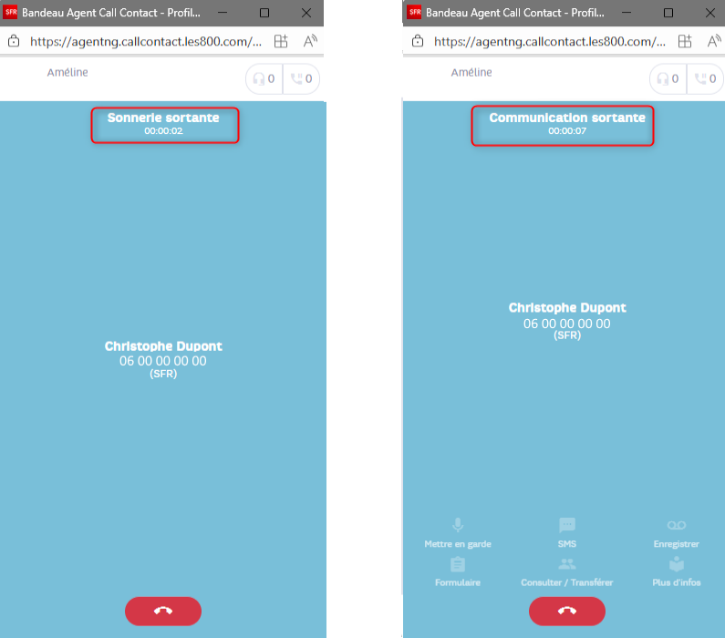 Le bandeau passe alors en statut « Sonnerie sortante », puis en « Communication sortante » dès que votre correspondant décroche.
