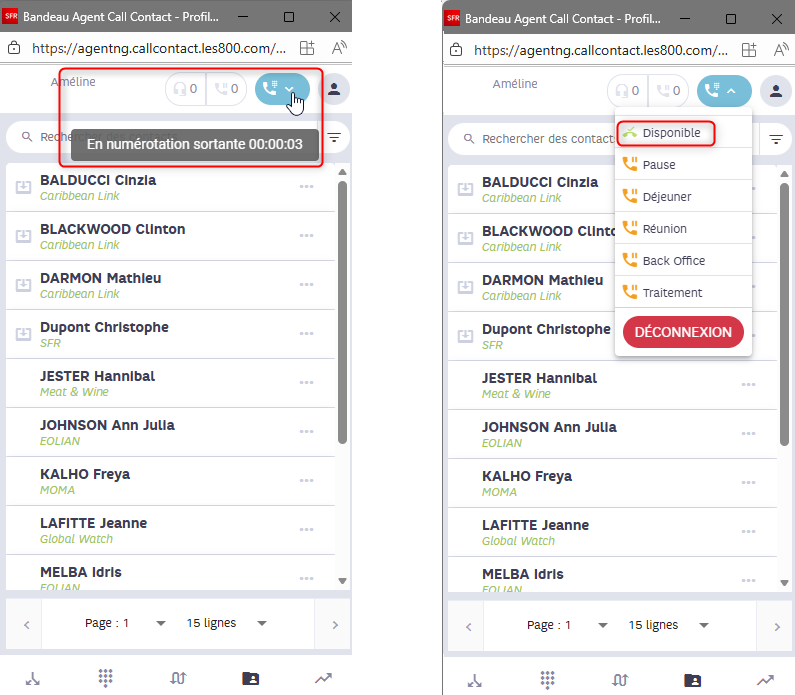 Au raccroché de l’appel, le bandeau passe en statut « Numérotation sortante« , l’agent peut alors soit attendre la fin du post-appel pour revenir automatiquement en statut « Disponible » ou utiliser la flèche à côté de l’icone du téléphone pour ouvrir les statuts et passer en disponible.