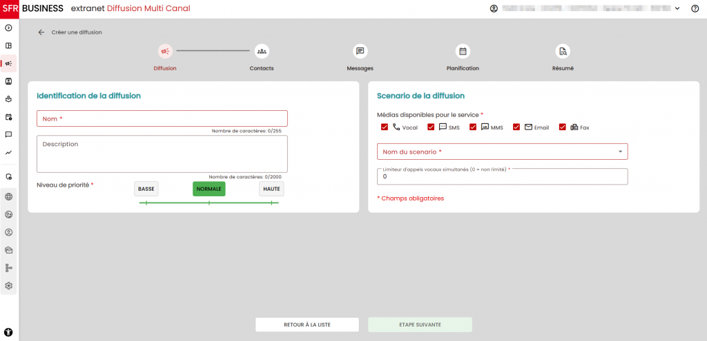 - Diffusion : définition des informations générales (nom, description, scénario utilisé, médias disponibles, priorité, limiteur d’appels simultanés).