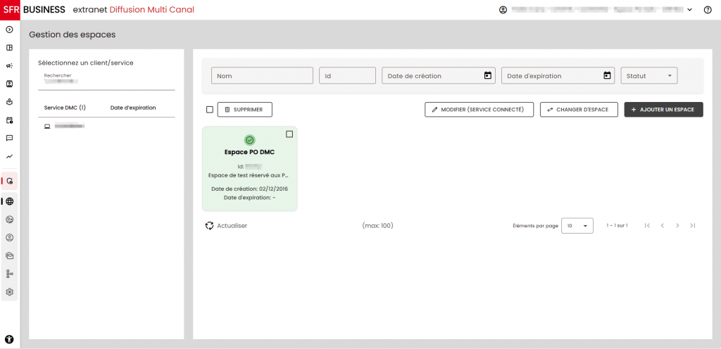 Après avoir sélectionné un service DMC, les espaces liés à ce service sont affichés dans la partie droite de l’écran.