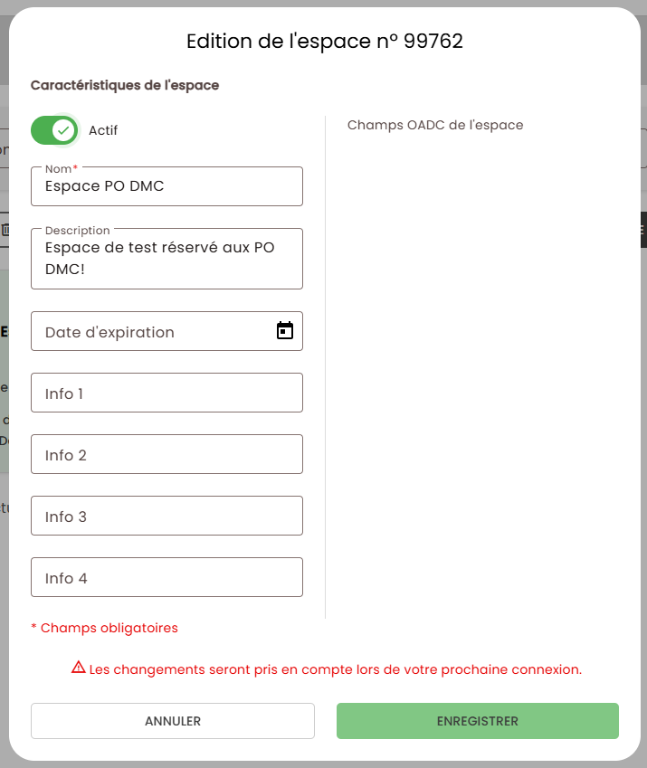 - Date d’expiration : Date à laquelle l’espace sera désactivé automatiquement s’il n’est pas prolongé.
