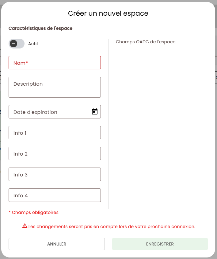 - Actif : Cochez si l’espace doit être activé dès sa création.