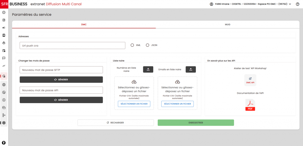- Modifier le mot de passe d’accès aux API (affiché uniquement si option API DMC activée).