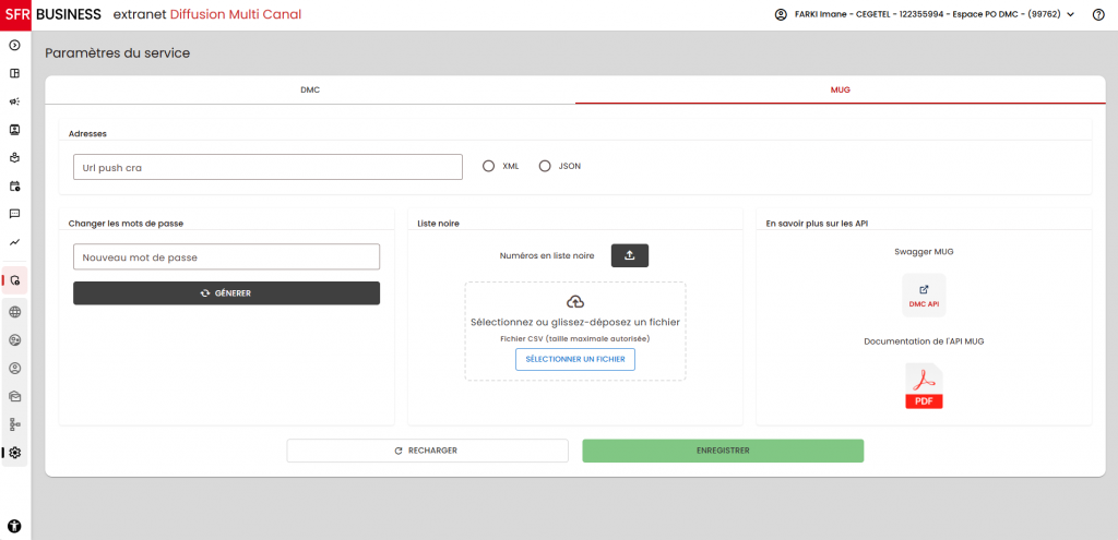 - MUG et DMC activés simultanément : les deux onglets MUG et DMC sont affichés, permettant un accès complet aux paramètres de chaque service.