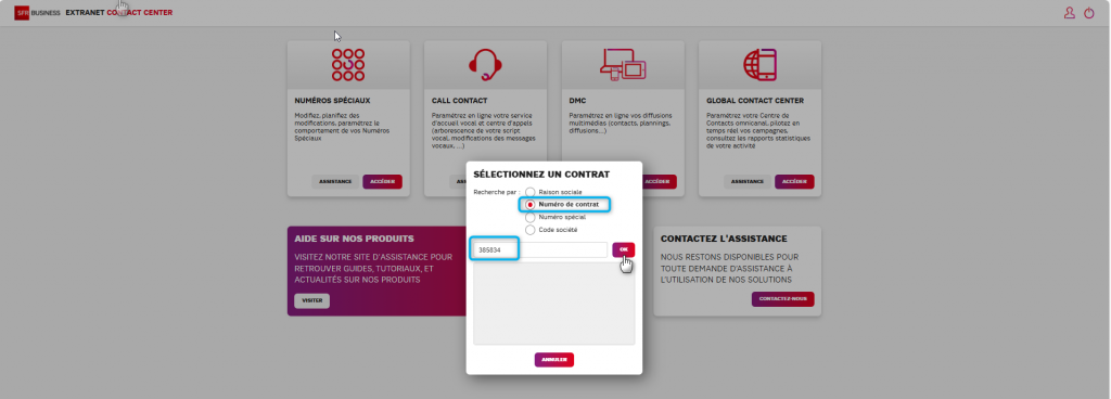 Saisir le numéro de contrat ou la raison sociale dans le champ prévu à cet effet.