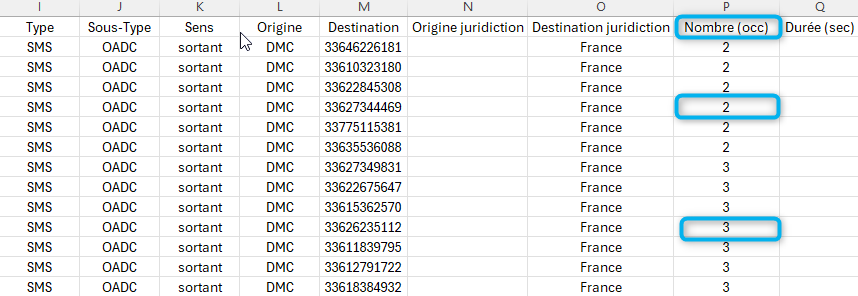 Une fois le fichier des statistiques ouvert, vous y trouverez la colonne « Nombre (occ) » (occ = occurrence), qui indique le nombre de SMS envoyés regroupés dans un seul SMS long.
