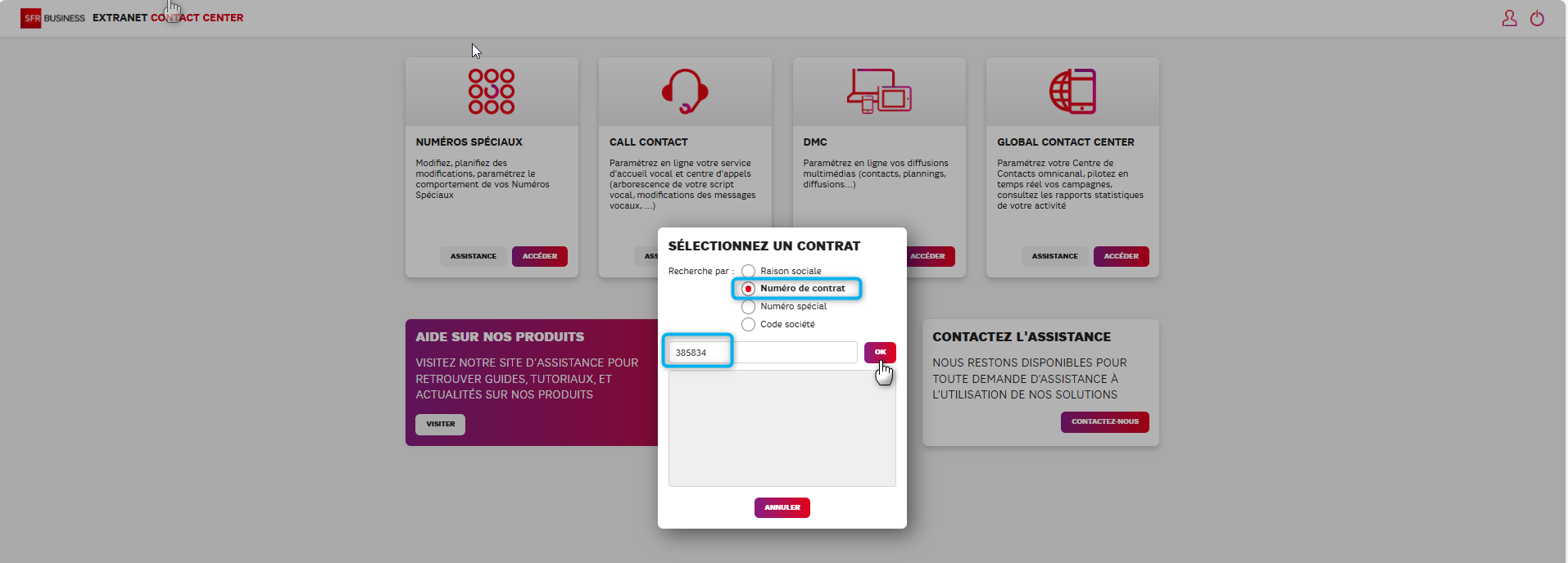Saisir le numéro de contrat ou la raison sociale dans le champ prévu à cet effet.