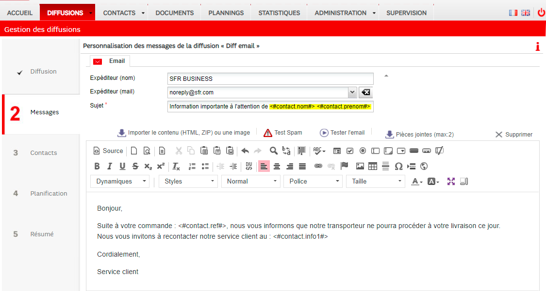 A l’étape « 2-Message » du paramétrage d’une diffusion (depuis l’extranet), on retrouve l’éditeur wysiwyg qui permet de créer l’email.
