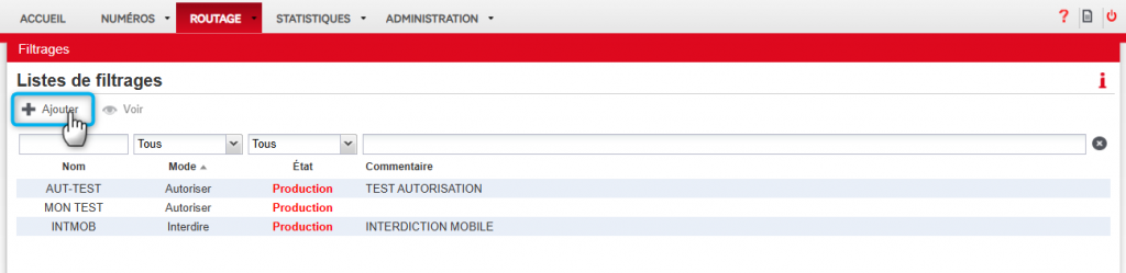 Dans l’onglet « ROUTAGE » sélectionner le menu « Filtrage »
