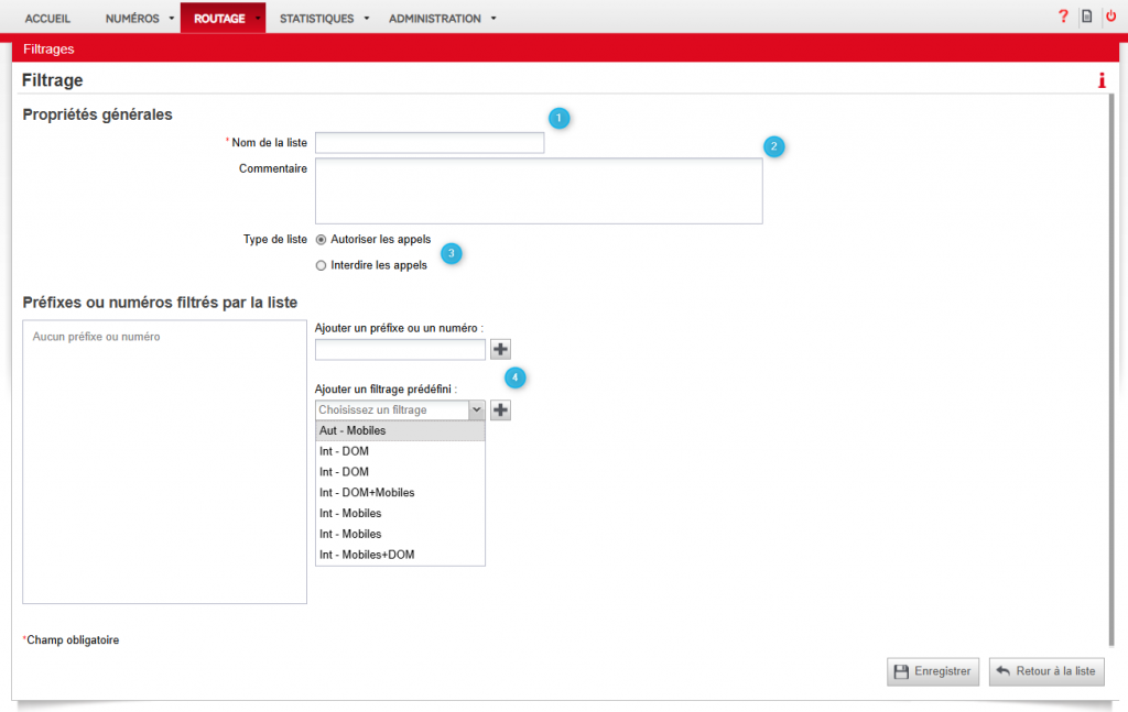 1 Le nom de la liste doit être unique au sein de votre contrat. Ce nom vous permettra de référencer la liste de filtrage dans vos arbres de routage. Il s’agit donc d’un identifiant et à ce titre il n’est plus modifiable une fois enregistré. Il doit être alphanumérique.