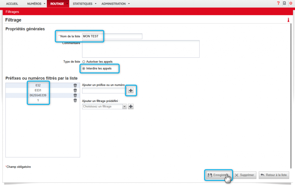En plus des préfixes, il est possible de bloquer des numéros. Pour cela il faut renseigner le(s) numéro dans leur intégralité au format national avec le 0.